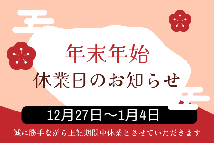 誠に勝手ながら、下記期間を年末年始休業とさせていただきます。 休業期間:12月27日(土)~1月4日(日) 期間中にいただいたお問い合わせにつきましては、1月5日(月)以降、順次対応いたします。ご不便をおかけいたしますが、何卒ご理解のほどお願い申し上げ...